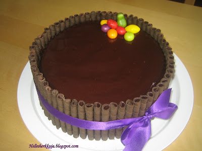 Onneksi tosiaan joskus saa yllättyä myös positiivisesti; tämä onnistui aikasta mainiosti. Koristelua pähkäilin pitkään enkä keksinyt mitään kivaa tuohon päälle, mutta sitten mies muistutti Vegasin tuliaisina saamistani karkeista ja ne toivat ihanat värit kakkuun. :) Päällinen ei mennyt ihan tasaisesti, mutta oli mun eka suklaapäällystys jota jännitin kovasti; harjoitus varmaan tekee tässäkin mestarin.. :) Pohja mehevä suklaakakkupohja, täytteet valkosuklaatäyte+Lemon Curd sekä mansikkatäyte, päällä suklaakuorrutus. Reseptit Kinuskikissalta. Reunoilla tuollaisia pyöreitä keksejä joita saa metallipurkissa, enpä muista nimeä, valitsin sen "tummasuklaa"-version. Tämä oli tosi hyvää, aika tuhtia ja tosi suklaista, vähän Sacherkakku-henkistä.. Nam. Nauha jäämistöä meidän häistä. ;)